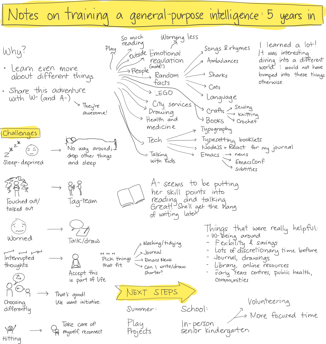 Why? training a general-purpose intelligence: 5 years in Learn even more about different things Share this adventure with W- (and A-) So much reading Worrying less Play Songs & rhymes Ambulances Sharks Cats Language Crafts Sewing Knitting Books Crochet Typography They're awesome! Challenges Sleep-deprived No way around;- drop other things and sleep Outside Emotional regulation (mine!) People Random facts → LEGO City services Drawing Health and medicine Tech Talking with kids I learned a lot! It was interesting diving into a different world. I would not have bumped into these things otherwise. Touched out/ talked out Tag-team Talk/draw HHH Worried Interrupted thoughts Accept this is part of life Pick things that fit Typesetting booklets NodeJS+React for Emacs news my journal Emacs Conf Subtitles A- seems to be putting her skill points into reading and talking. Great! She'll get the hang of writing later Washing/tidying Journal Emacs News Can I write/draw shorter? Things that were really helpful: W-being around Fexibility & savings Lots of discretionary time before Journal, drawings Library, online resources Early Years centres, public health, Communities Choosing differently That's good! We want initiative. NEXT STEPS Summer: Take care of myself, reconnect Play Projects Hitting School: In-person senior kindergarten Volunteering More focused time